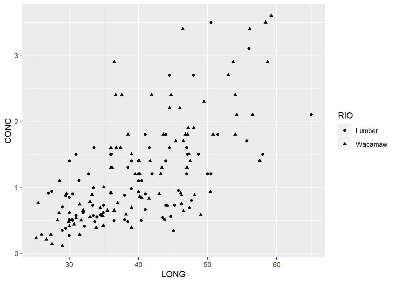ggplot(mercurio, aes(x = LONG, y = CONC, col = RIO)) +